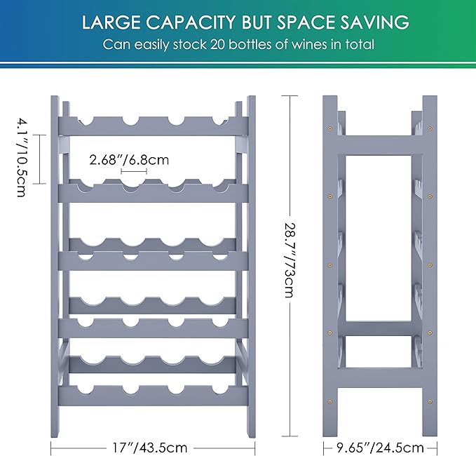 - ★ LARGE CAPACITY BUT SPACE SAVING: 4 bottles on each shelf, this nice 5-tier wood wine rack can easily stock 20 bottles of wines in total. Boasting a narrow vertical design, it is a wine rack for space efficient storage in your living room, kitchen, dining room, pantry or wine cellar etc.