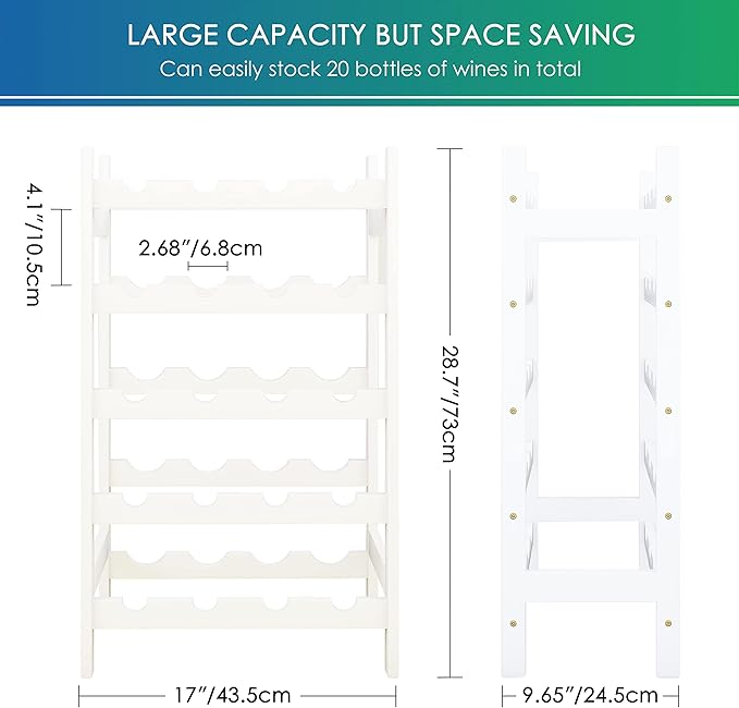 - ★ LARGE CAPACITY BUT SPACE SAVING: 4 bottles on each shelf, this nice 5-tier wood wine rack can easily stock 20 bottles of wines in total. Boasting a narrow vertical design, it is a wine rack for space efficient storage in your living room, kitchen, dining room, pantry or wine cellar etc.