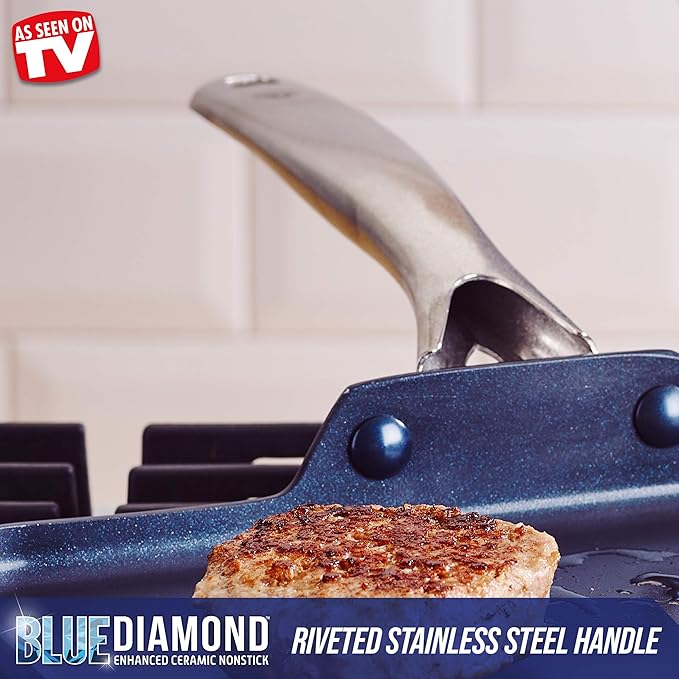 Blue Diamond 14 Piece Nonstick Cookware Set & 11" Griddle Pan, Diamond Ceramic Pots & Pans, Dishwasher & Metal Utensil Safe, Non Toxic PFAS-Free, Kitchen Cooking Sauce & Saute Pans, Oven 600F, Blue