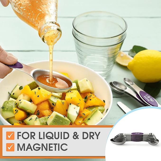 Spring Chef Purple Stainless Steel Magnetic Measuring Spoons Set of 8 with Leveler, Dual Sided Metal Teaspoon & Tablespoon Measuring Spoons, Kitchen Gadgets for Baking & Cooking, Fits in Spice Jars