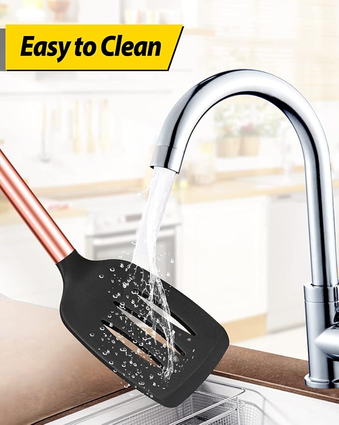 Pack of 4 Silicone Cooking Utensils Set, Non Stick Large Solid Spatulas, Heat Resistant Rose Gold Black Slotted Spoons, Ideal BPA Free Kitchen Turners for Frying, Mixing,Serving,Draining,Turning
