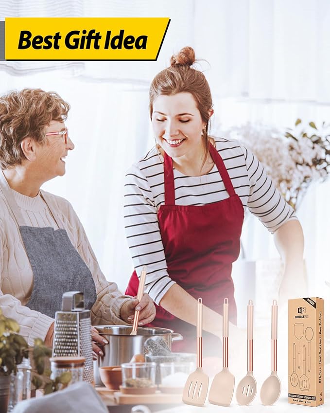 Pack of 4 Silicone Cooking Utensils Set, Non Stick Large Solid Spatulas, Heat Resistant Rose Gold Khaki Slotted Spoons, Ideal BPA Free Kitchen Turners for Frying, Mixing,Serving,Draining,Turning