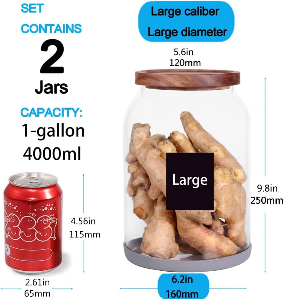 SAIOOL 1 Gallon Glass Jar with Wooden Acacia Airtight Lid,Large Glass Storage Jar set of 2, BPA-Free Cereal Dispenser Jars for flour,Spaghetti Pasta, Powder, Tea, Coffee