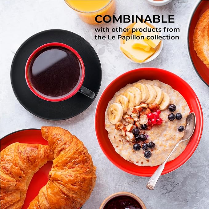 MIAMIO - Set of 6, Ceramic Stackable Cappuccino Cups Set / 6 Ounce Cappuccino Mugs and Saucer with Metal Stand for Coffee Drinks, Cafe, Latte, Americano and Tea - Le Papillon Collection (Red)