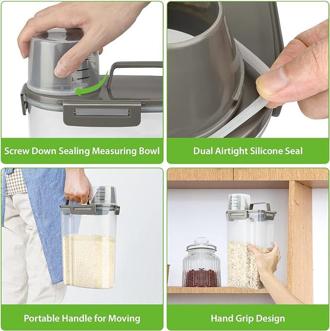 - SMART KITCHEN STORAGE CONTAINER: make your pantry perfectly organized with this smart container. Suitable for Beans, Flour, Sugar, Coffee, Rice, Nuts, Snacks, Pet Food and More (Note: Container storage capacity varies by food. Only store about 3 lbs of pet food or flour.)