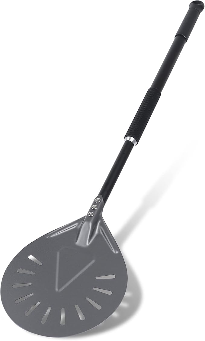 - UNIQUE PERFORATION DESIGN:Perforated pizza peel is a great design. They allow steam to escape, make a crisp bottom crust, minimize burnt flour clinging to the bottom of your pie, It easier to slide pizza in and out of oven without sticking to the peel
