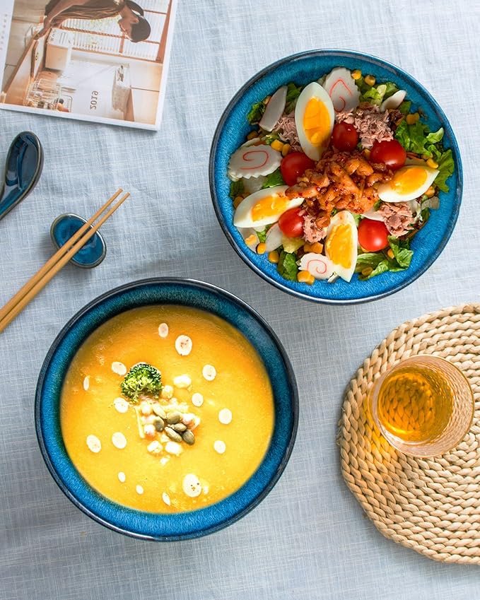 - Set of Bowls, Chopsticks, and Spoons: Are you looking for a special bowl set for salads and ramen? All your needs can be met with this elegant large ramen bowl set. Ramen bowl sets come with everything you need (chopsticks, spoon, and chopstick holder). You'll feel like you're dining in a fancy restaurant when you serve your family and guests dinner with these lovely bowls and chopsticks.