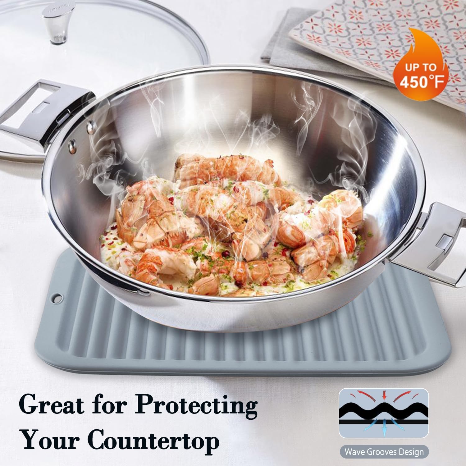 - 🍳【FOOD-GRADE KITCHEN HOT PADS】: The grey trivets for hot dishes use high-quality food-grade silicone that is 100% BPA-free and built to be long-lasting and flexible; super safe to grab a hot pan or dish. The size is 9x11.6 inches, suitable for any style pan or pot.