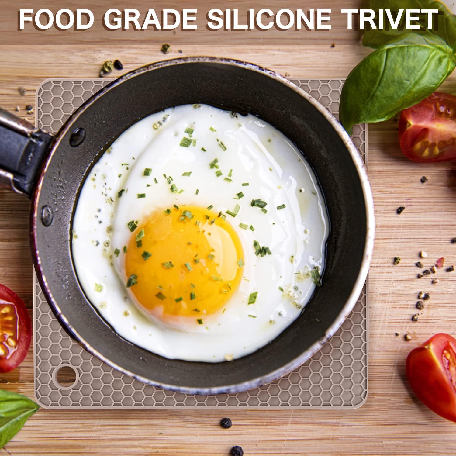- 🎯【NONSLIP & FLEXIBLE】The 4 pack almond kitchen trivets are soft and slip-resistant, helping us to get a comfortable grip while you cook; the double-side honeycomb pattern helps us hold tight to hot pans, pots, and baking sheets without hindering the natural grip. Also, the silicone hot pad is leakproof so that the cold or hot liquids won’t flow to the desktop.