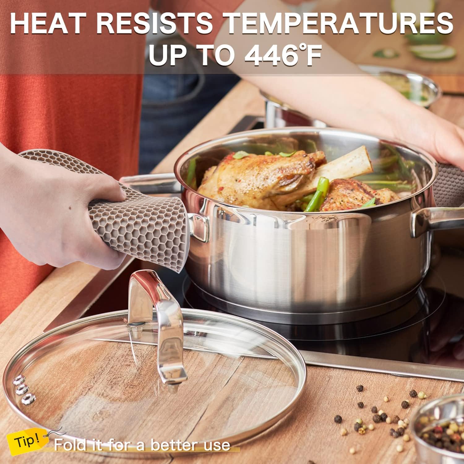 - 🎯【HIGH HEAT RESISTANT】These 4 pack silicone pot holders for kitchen heat resistant temperature is up to 446℉ (230℃), effectively protecting the countertop and tabletop from the damage of heat marks, liquids, and scratches. Safe for use in an oven, microwave, dishwasher, or freezer.d silicone trivet is cyclic usable, safe, reliable, and environmental.