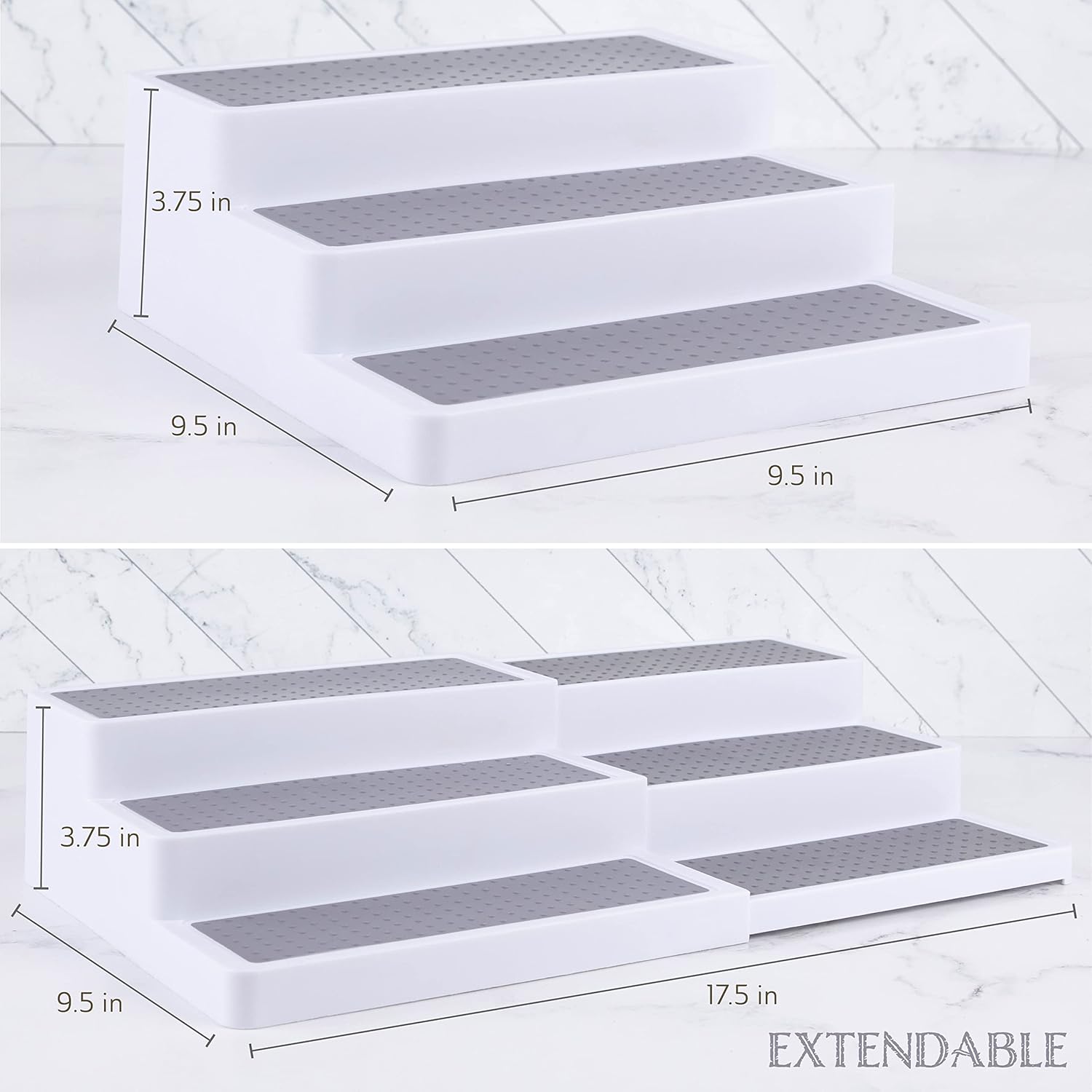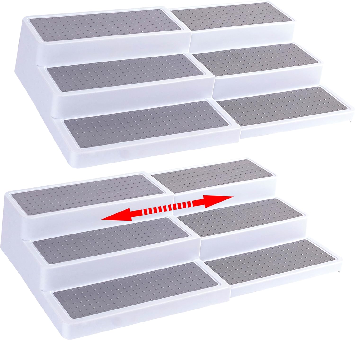 Oizeir Plastic 3-Tier Expandable Spice Rack, Adjustable Length, Stability with Non-Skid Shelf, For Easy Visibility, Organizer for Kitchen Cabinet, Pantry or Countertop, (2-Pack), White/Grey