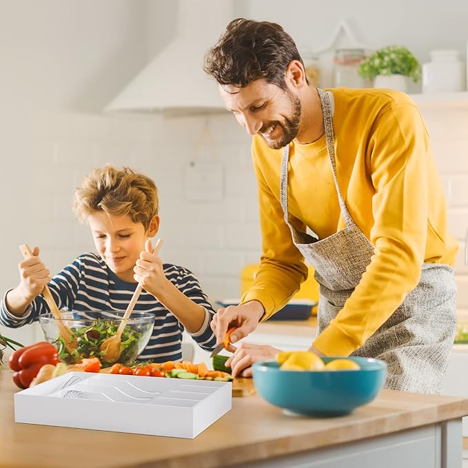 - 【Made of natural bamboo】Our flatware organizer is made of natural bamboo. The material is taken from bamboo that have grown for more than 4 years which make our silverware holder for drawer use a durable kitchen piece that ll last you for years. The Environmentally material keep our flatware & utensil water and odor resistant. Even the knife won't leave scratch on it.