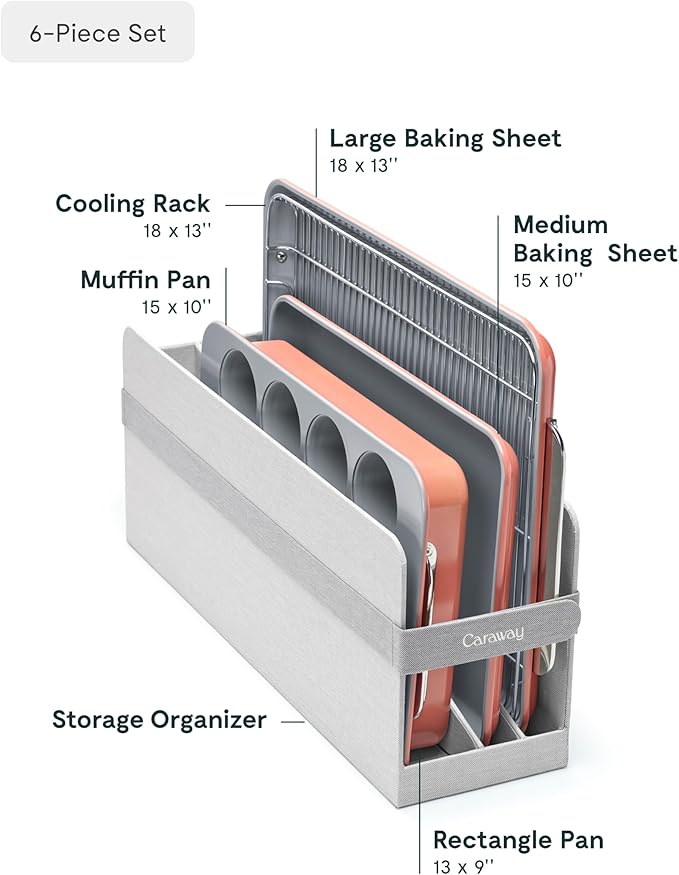 - WHAT'S IN THE BOX: Included in this 5-piece bakeware set is a 18x13" baking sheet, 10x15" baking sheet, 12 cup muffin pan, 9x13" rectangle pan, and 1 storage organizer.