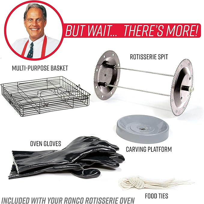 - PLATINUM EDITION INCLUDES: Ronco Platinum Edition Rotisserie Oven with digital controls, multi-purpose basket, rotisserie spit, carving platform, removable drip tray, oven gloves, food ties