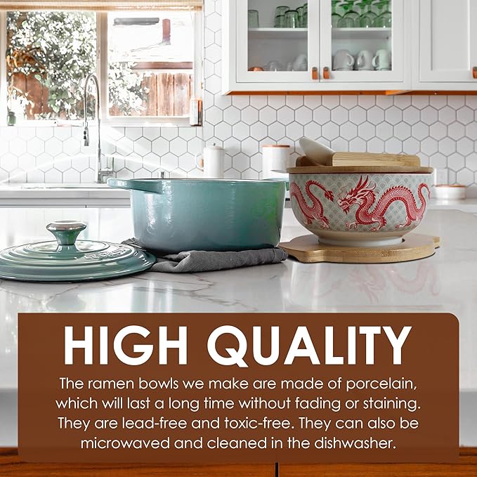 - 【PERFECT SET】Each set comes with 5 pieces: a ramen bowl, a spoon, a pair of chopsticks, one wooden lid, and a trivet that prevents heat damage to your tables and countertops. You will feel as if you are eating at a deluxe restaurant actually eating at home, with everything you need for that best ramen experience