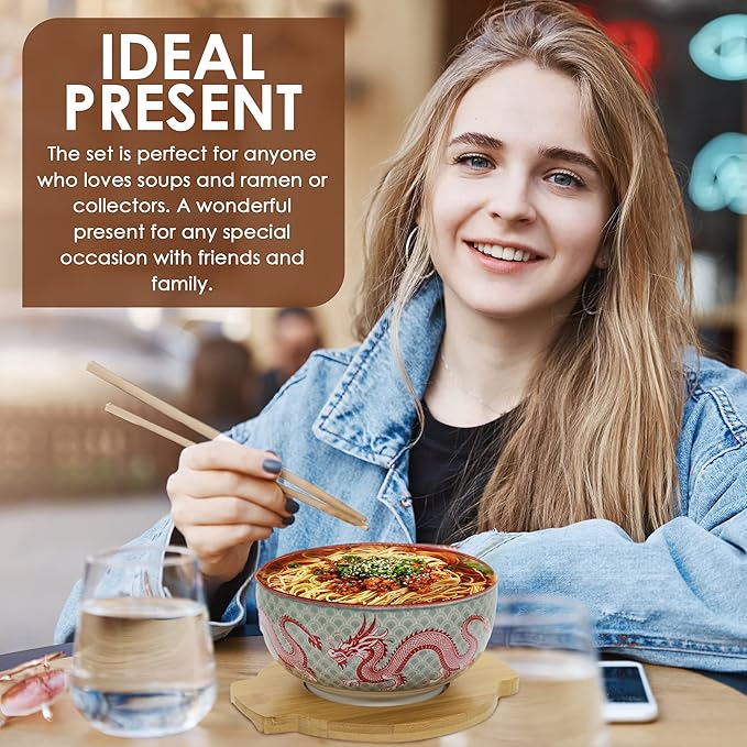 XWORLD Japanese Ceramic Ramen Noodle Bowls Set with Ceramic Spoon, Bamboo Chopsticks, Lid & Trivet, Serving Capacity of 33.8 OZ, Microwavable Oven Safety (3.3” x 6.6” D) (Red Dragon)