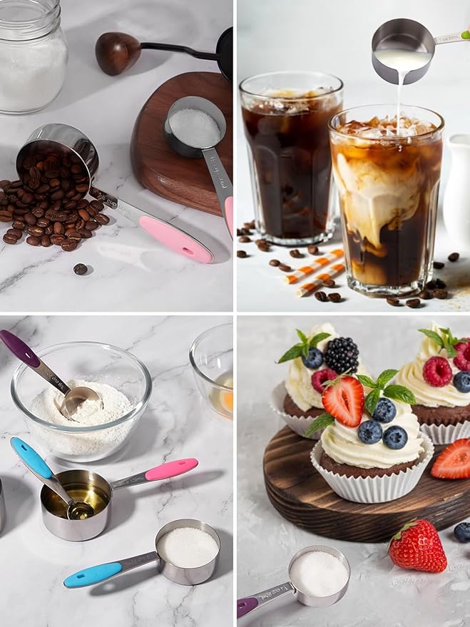 - Must-Have Kitchen Gadgets: The ergonomic handle is thickened to accommodate the weight required during the cooking process. Not easily deform. The spoons are made of foundry technology in one piece. And the welding between the body and the handle of measuring cups is very stable and durable. BPA-free silicone handle provides a better grip experience and prevent slippery. Help you stop wasting the seasoner and get a better cooking result