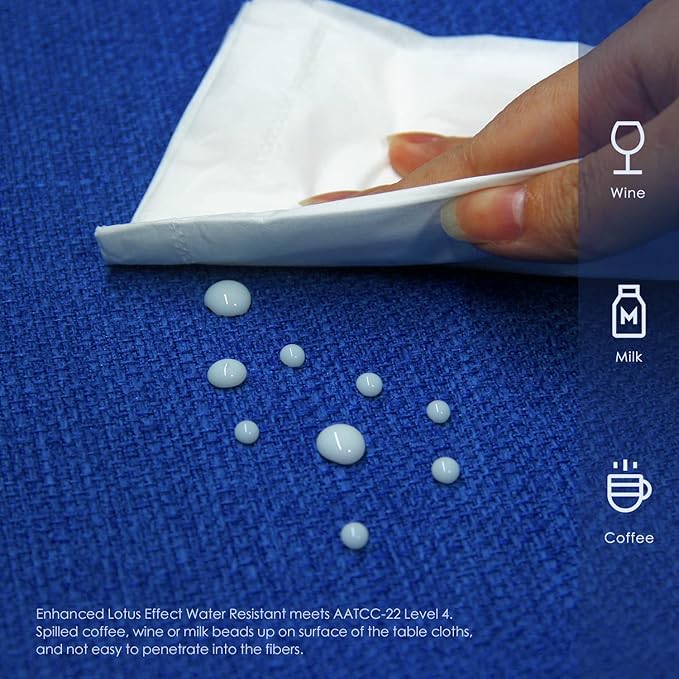 - 【Waterproof Table Cover】Enhanced Lotus Effect Water Resistant meets AATCC-22 Level 4. Spilled coffee, wine or milk beads up on surface of the table cloths, and not easy to penetrate into the fibers. You can absorb the droplets with napkin paper and you NO LONGER need to change and wash the table cloth every day