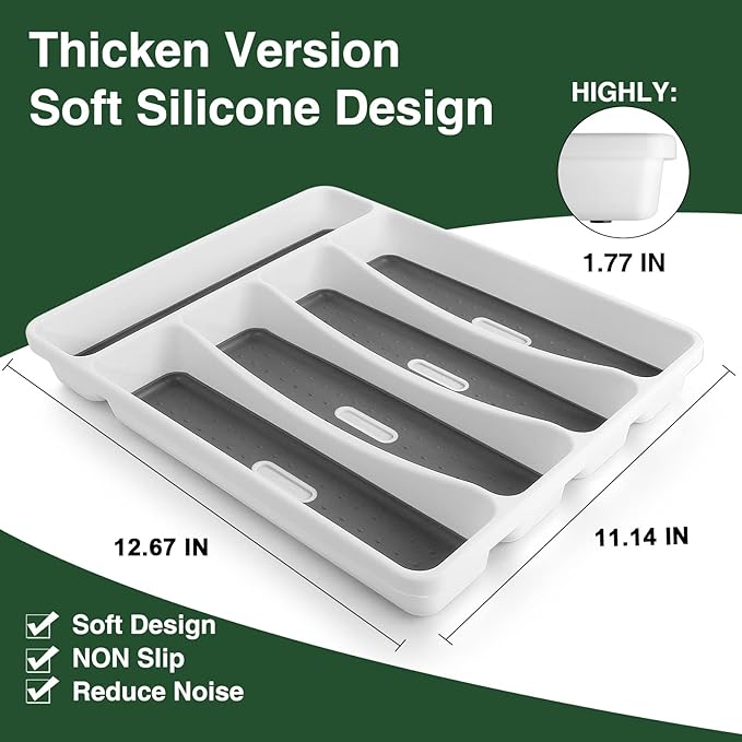 - SILVERWARE SET WITH TRAY OFFERED: This 12.67" x 11.14" drawer organizer with five compartments provides a great solution to your tableware. The silverware organizer allows for neat storage, and fits into most kitchen drawers. Reliable plastic materials that are doing well with normal wear and tear. Non-slip rubber feet designed ensures that items stay in their place