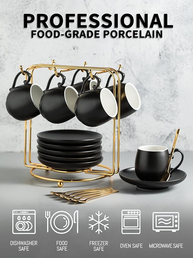 - The espresso coffee cup and saucer set with matted design style is delicate and elegant. The porcelain espresso cups and saucers set is ideal for that morning single-shot or double shot of espresso, or to enjoy a dessert time or tea time. The saucer easily holds your coffee cup, coffee scoop, or sugar packet. The beautiful spoon will give you a pleasant feeling when drinking tea or coffee.