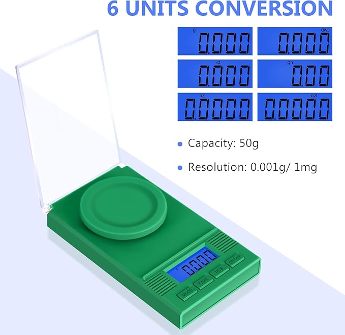 - PRECISE MEASUREMENT - Milligram scale with high precision sensors, 50g capacity and 0.001g resolution. Comes pre-calibrated, make sure the precise measurements with accuracy ±0.003g. Good for high accuracy weighing needs like jewelry, gem, diamonds, powder.