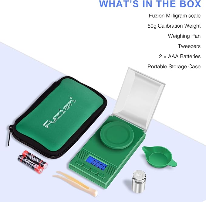 Fuzion Milligram Scale 50g/ 0.001g, Portable mg Scale with LCD Backlit, Tare, Digital Jewelry Scale, Microgram Scale for Powder, Gold, Gem, Reloading, Batteries Included