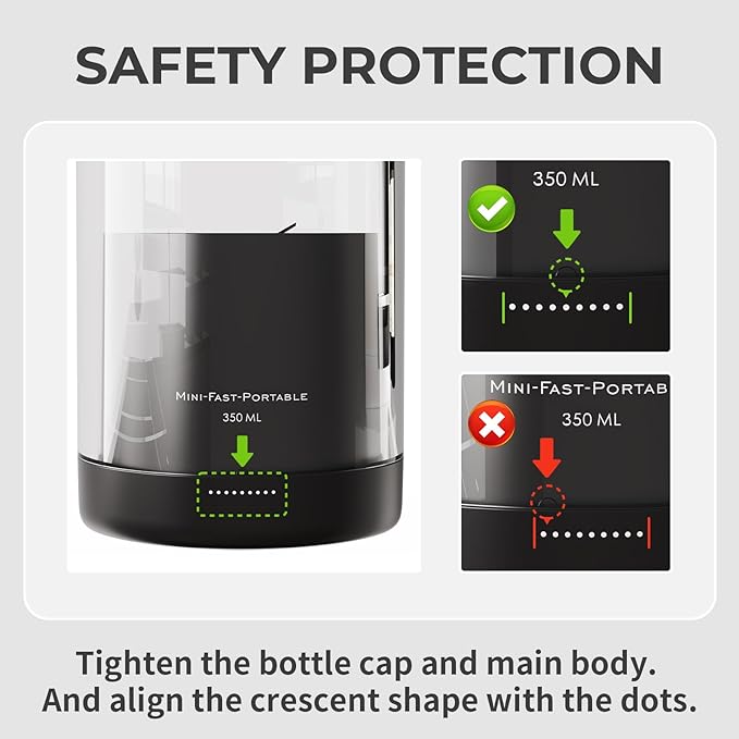 - Safety Protection Device: There is a safety protection device at the bottom of the blender. If the bottle and motor are not tightened, to avoid injury, the machine will not work, and the power button at the bottom will flash red as a reminder. Please tighten according to the instructions in the second main picture