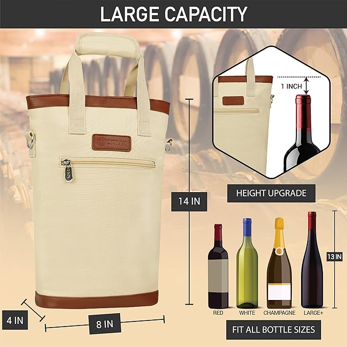 - PREMIUM PICNIC WINE CHILLER: OPUX 2 bottle wine tote carrier measures 8.5 x 4 x 14 (L x W x H), it fits most standard 750ML wine bottles. Crafted from high-quality 600D polyester, this wine bag is built to last, while the PU leather trim adds a touch of sophistication. The sturdy double handle features a Velcro closure strap for secure carrying. Apart from wine, this classy wine bag can accommodate other alcohol bottles such as liquor, champagne, spirits, and even wine glasses.