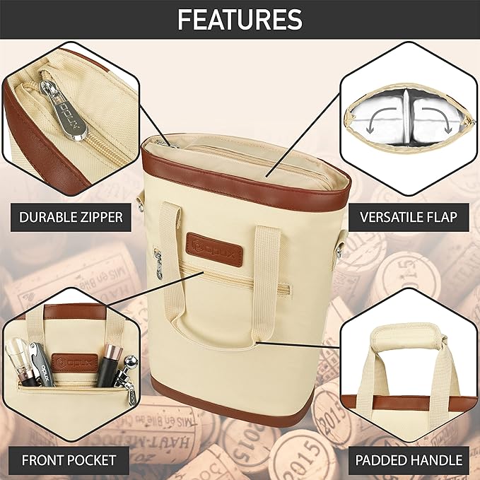opux Two Bottle Wine Bag Carrier Tote, Insulated Leakproof 2 Bottle Wine Cooler Bag for Travel BYOB Picnic, Portable Wine Case, Gift for Men Women Wine Lover Birthday Party Christmas, Cream Beige