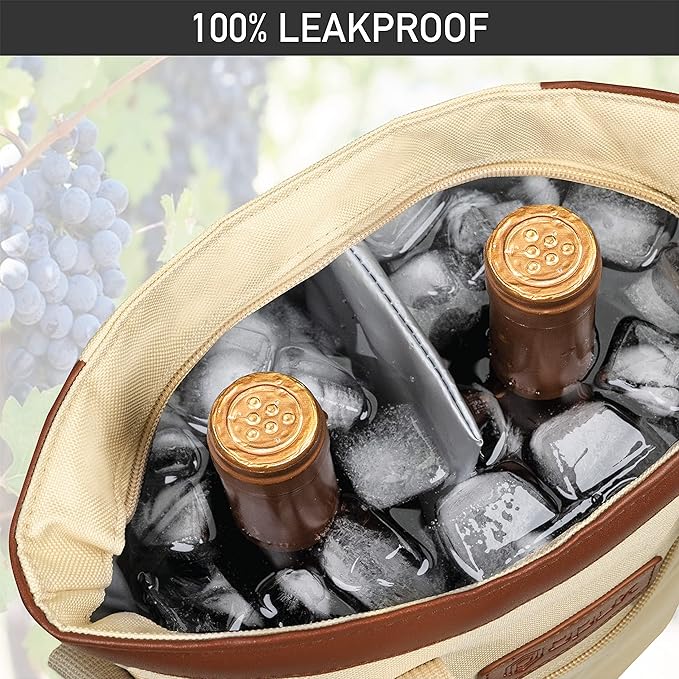 - INSULATED & LEAKPROOF WINE COOLER BAG: Our insulated wine cooler bag keeps your wine at the perfect temperature for hours. Whether you're carrying the wine to a bar, picnic, camping, or road trips, this wine side bag is equipped with three layers of insulating material, maintaining a steady temperature for your glass bottles, chilled wines, frozen liquor bottles and cool beer beverages. The leakproof lining ensures no spills, and it's easy to cleana must-have item for wine lovers on the go!