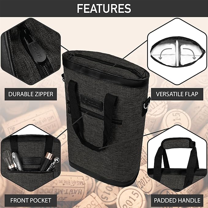 - 2 BOTTLE WINE CARRIER TOTE: Our portable wine cooler tote is the ultimate wine bag for your travel, parties, picnics, beach trips, and outdoor events. Designed to transport two bottles, this double bottle wine carrier ensures your favorite wine stays chilled and protected. It's an essential accessory for wine lovers, making it an ideal gift for women, men, and lovers who appreciate a good glass of wine. Celebrate special days with OPUX stylish and functional wine holder bag.