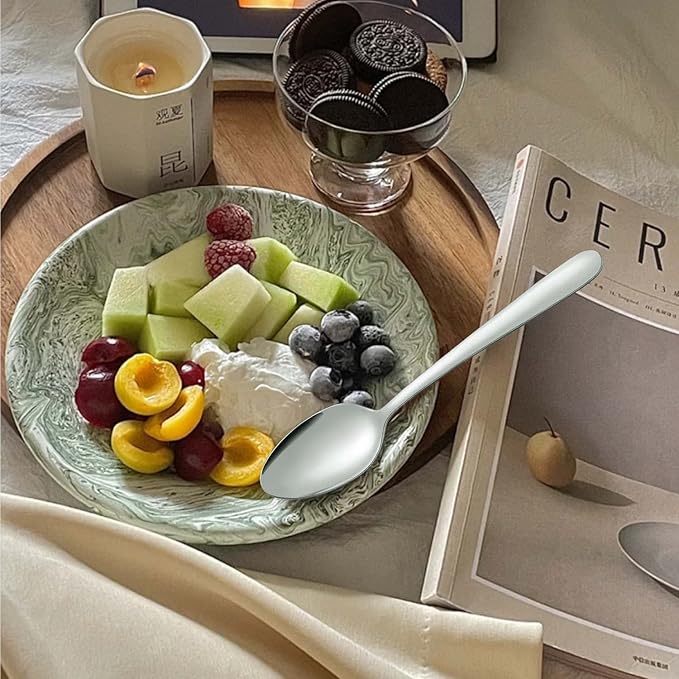 - 【Mirror Polished and Classic Design】 The spoon set are mirror polished, with smooth edge looks beautiful and luxurious, which makes it very comfortable to use without hurting your mouth. The spoons silverware design are simple, modern and elegant, with graceful line, perfectly shaped and sized, which have a classic design allows for mix and match with your existing flatware to elevate everyday meals into a fine dining experience