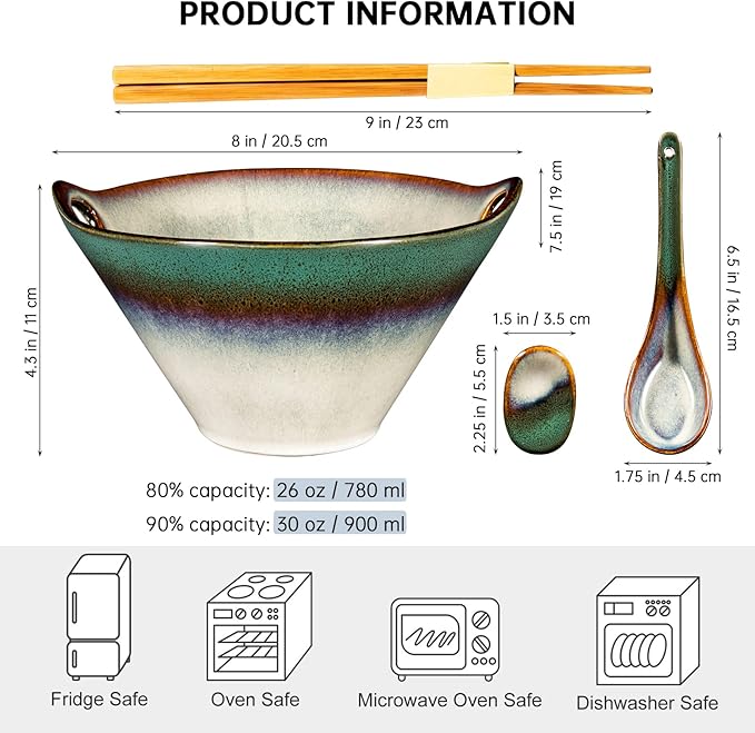 - Perfect Size for Multiple Uses: The bowl is deep enough for the ramen not to spill over or feel like it's too full. This bowl is ideal for soup, ramen, beef pho, udon noodles, salad, cereal, stew, etc. This 8 inch wide mouth Asian bowl is convenient for putting food in and taking food out, and it effectively shows you the ingredients and whets your appetite.