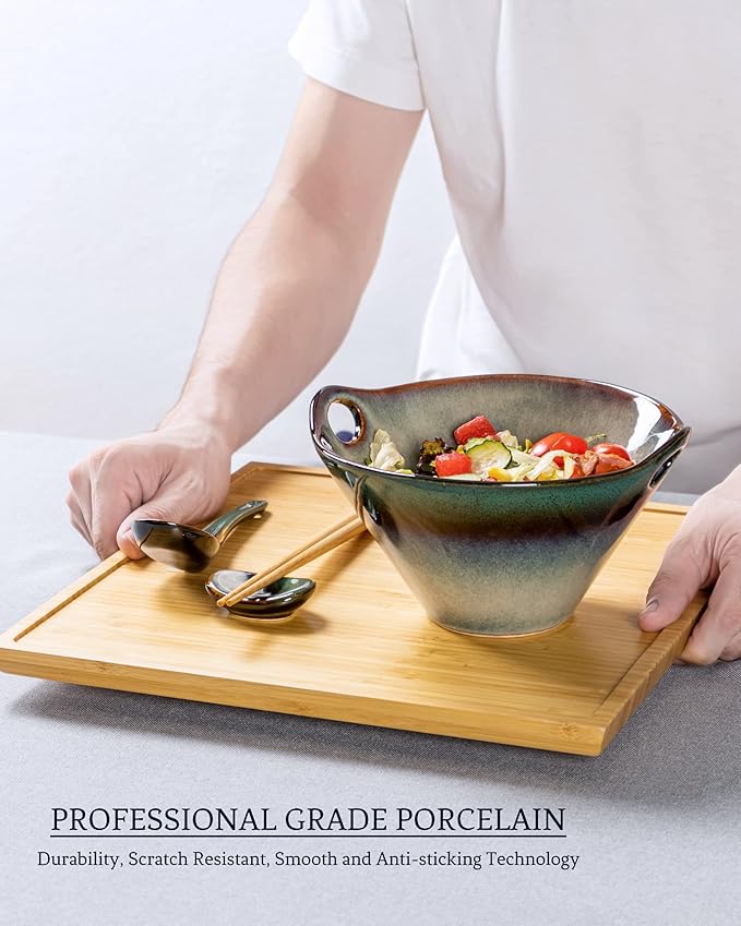 HENXFEN LEAD Japanese Ramen Noodle Bowl Set of 2-30 Oz Large Porcelain Salad Bowls with Chopsticks, Soup Spoons and Rests, Kitchen Serving Dishes for Pho, Udon - Reactive Green