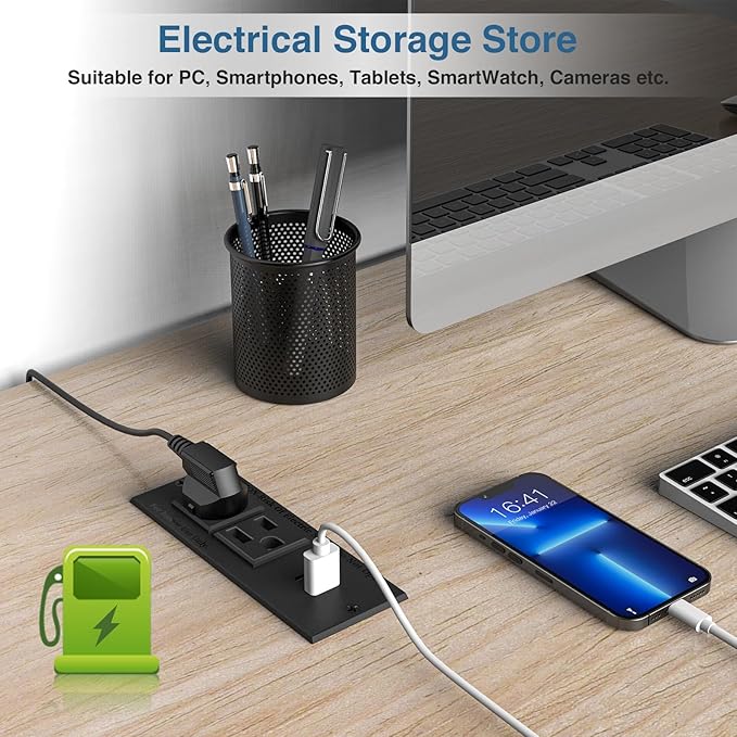 - 🍀Easy to install: cut a rectangle on the table, put the desktop power strip in and screw it on. Hole cutting size: L 3.8" * W 1.75" * H 1.5".