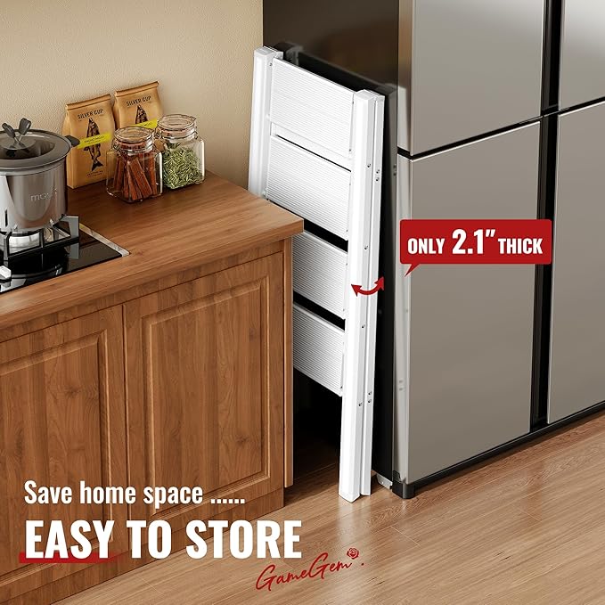 GameGem 4 Step Ladder, Aluminum Folding Step Stool with Anti-Slip Sturdy and Wide Pedal, Lightweight Portable Stepladder for Home and Kitchen Use, Cream White, 330 lbs
