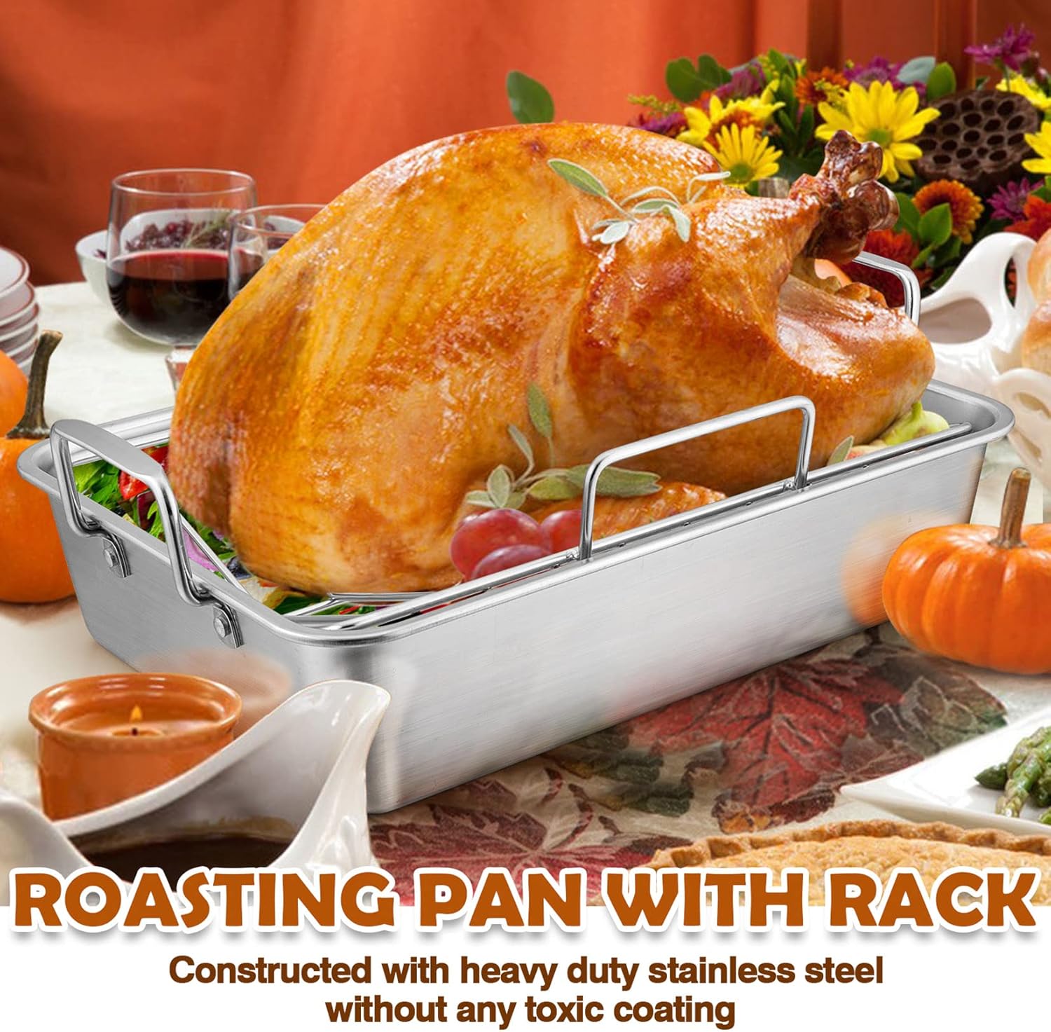 - 【PREMIUM MATERIAL】Joyfair roasting pan and V-shaped rack are made of pure stainless steel without any harmful chemical coating, Wouldn't release toxic material at high-temperature, Healthy for your daily baking, Great replacement to aluminum pan, Dishwasher safe to save your labor and hand-washing also convenient