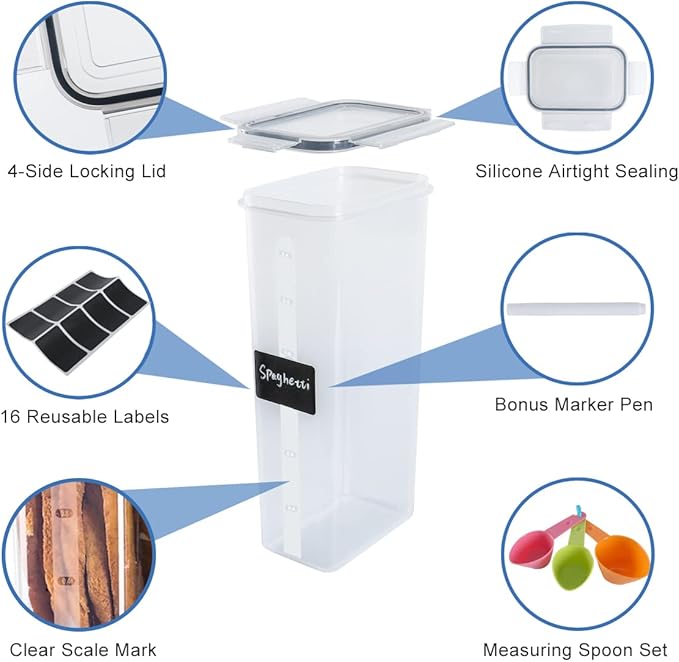 - Pantry & Kitchen Organization: Stackable food containers make it so easy to organize your kitchen countertop. Perfect for long term storage including dry food, flour, rice, cereal, baking supplies, spaghetti, pasta, nuts, sugar, oats, coffee, tea, snacks, pet food and other dry goods.