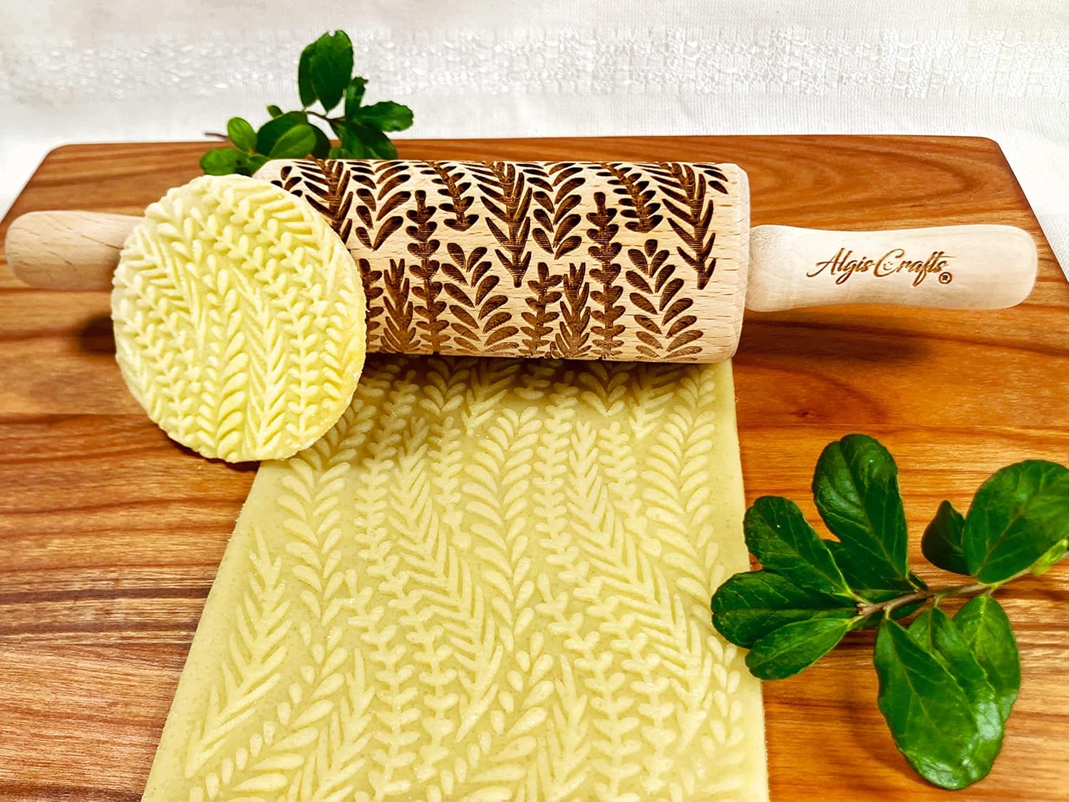 - COMFORTABLE DESIGN - This rolling pin with pattern is made with ergonomics in mind so that anyone can use its mesmerising designs! Rolling pin measures are approximately 9.5" (24 cm) from handle to handle, embossing part 4,5 inches (11 cm), diameter 2" (5 cm), made of beech wood. The finished product is food safe.