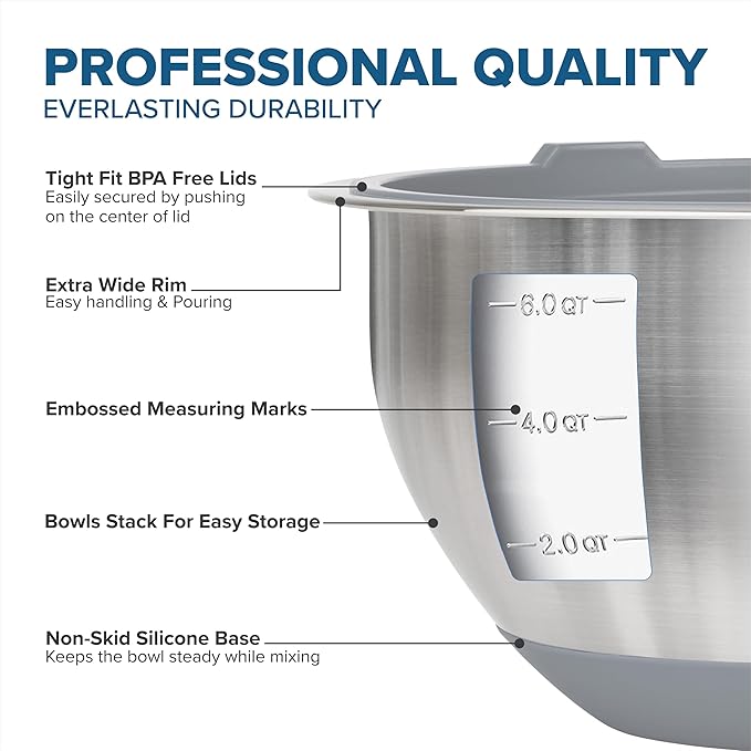 - TIGHT FIT BPA FREE LIDS AND NON-SLIP BASE: Each mixture bowl features an extended edge at the top of the bowl which allows for a comfortable grip during mixing, and the non-slip silicone base provides extra stability and prevents scratching of your countertop. Each mixer bowl comes with a BPA free tight-fitting lid so that ingredients can be prepped in advance and stay fresh until ready to use