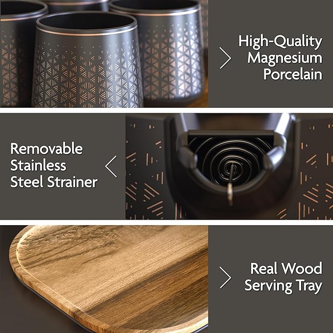- SERVE WITH STYLE: To make serving and enjoying your tea even more convenient, the set comes with a bamboo wood serving tray that is both durable and aesthetically pleasing. It's the perfect accessory for serving tea to guests or simply enjoying a relaxing cup of tea on your own.
