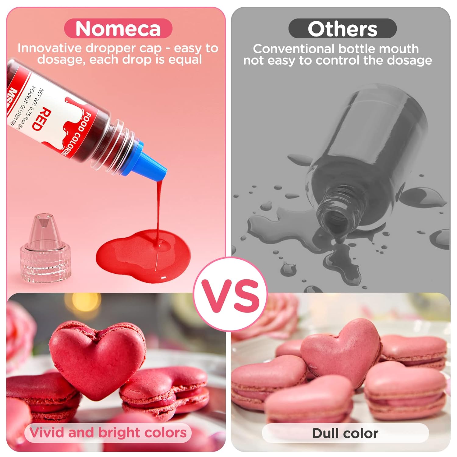 - FOOD GRADE NO TASTE FOOD DYE - Made from safe ingredients which approved by MSDS, Nomeca food grade liquid food coloring set is totally odorless and tasteless, won't alter the taste or texture of your dessert. Adding unlimited fun to your baking life. What's more, this 12 food coloring set is dairy-free, nut-free, sugar-free and gluten-free, vegetarians and kids can also eat with confidence