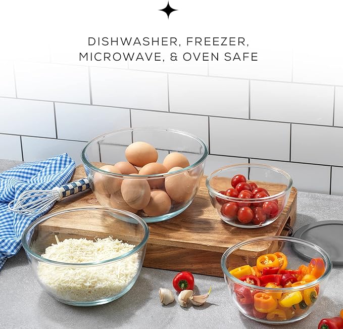 - Thick Strong Glass Mixing Bowl Set: Made from thicker and more durable glass - your clear bowls are robust They’re Dishwasher Safe Freezer Safe and and Microwave Safe containers (*NOT THE LIDS). Both lids and bowls are fridge safe. Made for mixing chilling and heating – not oven safe.
