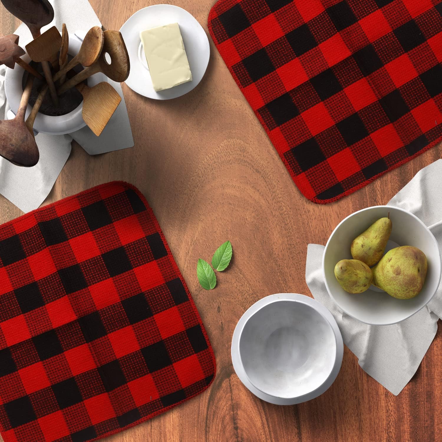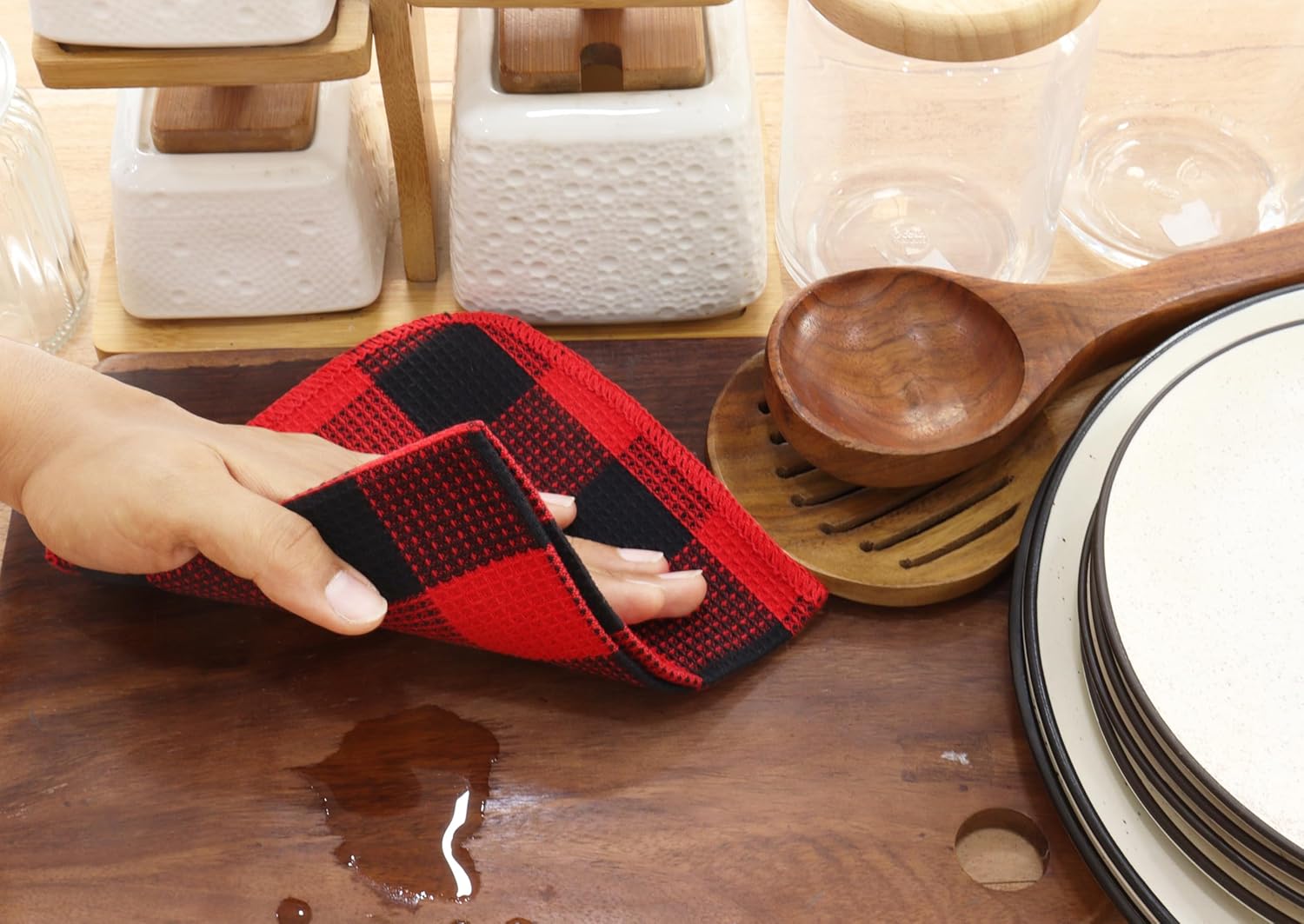 Waffle Weave Plaid Dish Cloths, 100% Cotton - 12 x 12 Inches, Ultra Soft Absorbent Quick Drying Dish Towels Buffalo Check Dish Rags for Kitchen, 8 Pack - Spring and Summer - Red & Black