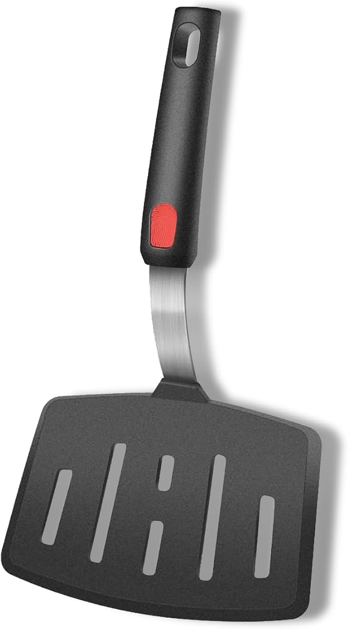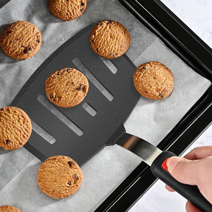 - 🥕The kitchen spatula have thin and hard blade edges make cooking easier and glides easily beneath most foods.The large spatula is sleek, comfortable to hold, and perfectly medium sized for a multitude of uses in your kitchen.