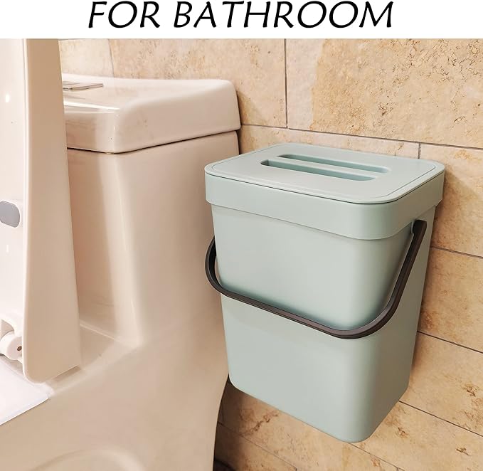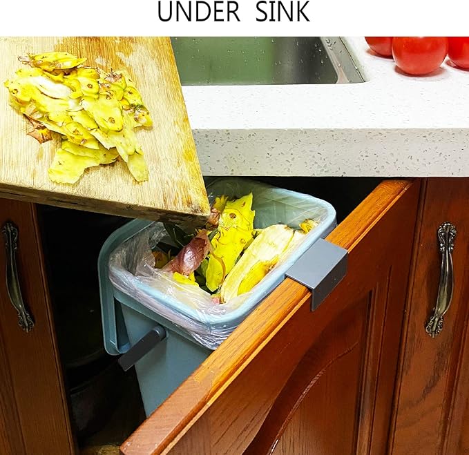 - Two Installation Options : Our kitchen trash bin can easily hang on the cupboard door with mount accessory included.It also can be hung on the wall by adhesive tape.You can use it as an under sink kitchen trash can, a wall-mount trash can, a countertop compost bin.