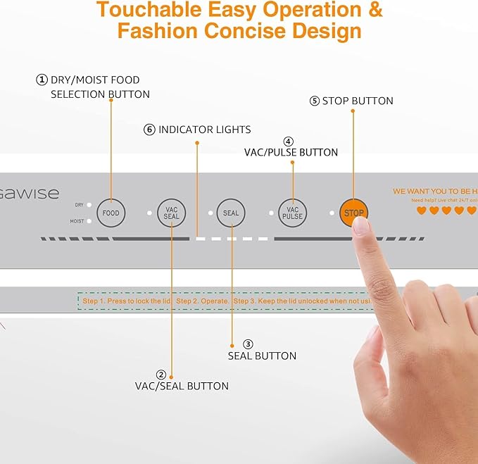 - Easy to use : Save Your Wisdom with just touch and done. One-touch operation and two specialized modes, you can get the food vacuumed in 10-20 seconds. The 12in sealing wire supports to seal 3-5 bags at one time. Choosing the Dry or Moist mode according to the food types, “Dry” mode for solid items and “Moist” mode for poached, simmered or steamed food, gives your food the most careful protects.