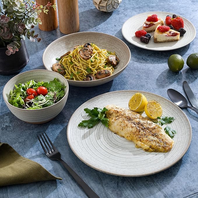 - WHAT'S IN THE BOX: Service for 4 that includes 4 of each of the following: 10.75” Dinner Plates, 8.5” Lunch/Dessert Plates, 9” Dinner Bowls and 6” Cereal Bowls