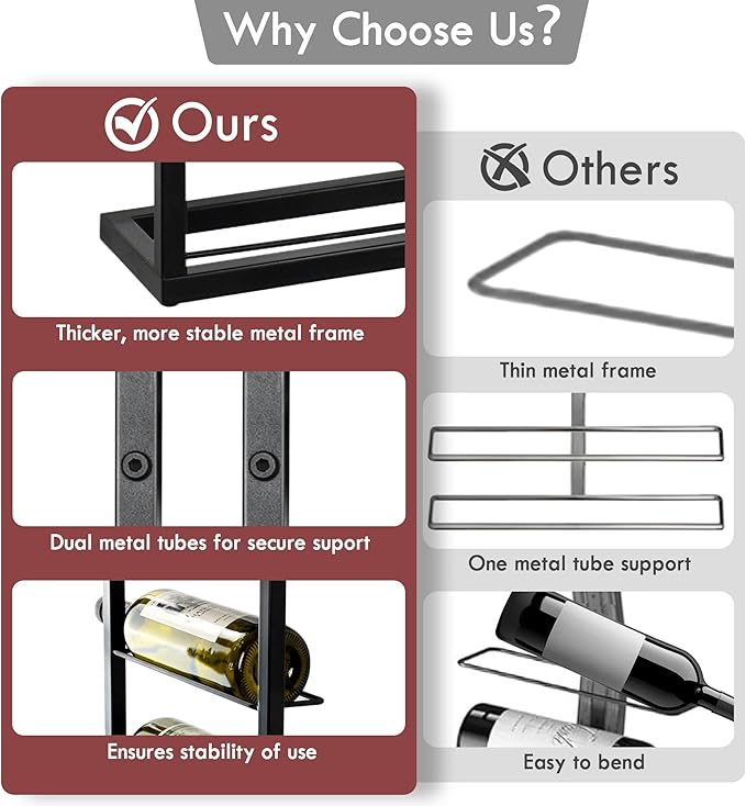 - Simple Installation Process: Install your wine rack in three easy steps: Measure and mark the distance between holes, create wall punctures and insert anchors, then assemble and mount the wine rack securely.