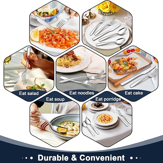 - Silverware set for 12, our stainless steel flatware set contains 12 complete place settings, including a dinner knife, dinner spoon, dinner fork, salad fork and teaspoon, this 60pcs cutlery set is great for your everyday use, dinner party, family gathering, outdoor, entertaining, restaurant, hotel